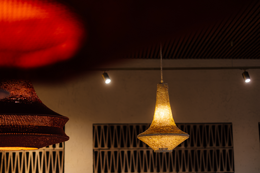 La pavimentazione in cotto e le pareti dalle texture materiche ricordano i vecchi casali italiani. L’illuminazione è stata studiata ad hoc per ogni ambiente: le sinuose lampade a sospensione della sala centrale sono artigianali, realizzate dal tradizionale filo kitan (tessuto marocchino in viscosa e intrecciato), che poggia su anelli di ottone massiccio fatti a mano. Al contrario, le lampade più tecniche dei binari sospesi con i faretti diffondono una luce più puntuale e mirata.