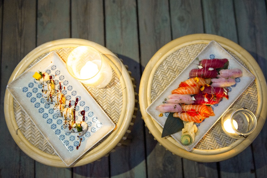 Il menu del Ristorante Japanese & Fusion si divide, infatti, in due parti. Una racconta il rispetto verso la tradizione giapponese, messo in pratica con il trattamento del pesce, lavorato non appena arriva al locale, “purificato” con sale o con soluzioni saline a seconda della provenienza, seguendo una pratica orientale, la stessa che si usa nella costruzione dei piatti, seguendo il pentagono dei gusti. L’altra parte, invece, presenta piatti fusion realizzati con ingredienti e ricette provenienti da tradizioni culinarie diverse. In pieno Japanese Mood si potranno degustare ottimi ravioli giapponesi (con carne, pesce e vegetariani), nigiri, hosomaki, uramaki, veggie roll, temaki e sashimi. Il Fusion invece spazierà tra tartare di salmone con avocado e salsa ponzu, cevice di spigola, hamburger di Wagyu e Salmon Tandori, cotto al forno e marinato con spezie e latte di cocco.