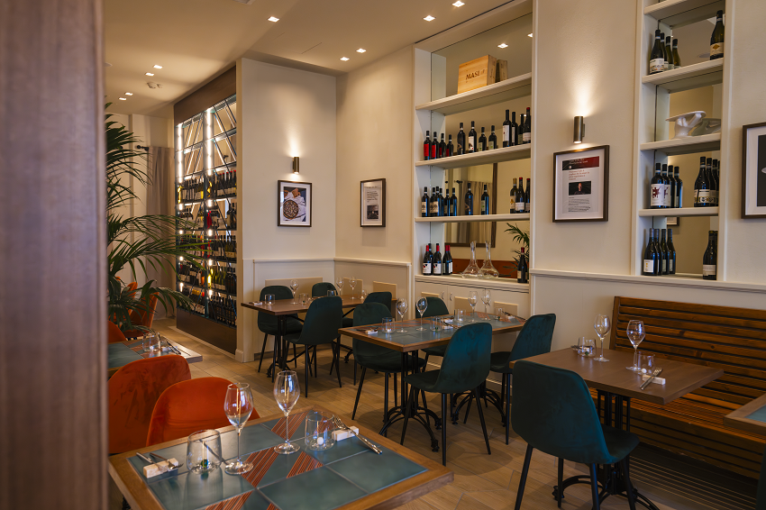 Lo spazio, intimo e luminoso, ospita una cinquantina di coperti. I toni verdi e i dettagli in ceramica di Vietri firmati Giovanni De Maio e Cristina Celestino donano un’atmosfera cosmopolita e al tempo stesso calda e familiare. "Vogliamo che ogni cliente si senta seguito dall’inizio alla fine", dice Calò. All’accoglienza si aggiunge un calice di metodo classico e un piccolo entrée come benvenuto.
