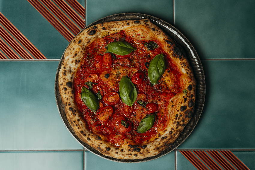 In cucina, Calò non lascia nulla al caso, a partire dalla farina. Ha creato un blend personalizzato, la Farina Intensa, ricca di crusca, pensata per conferire struttura all’impasto e un gusto che ricorda il pane appena sfornato. L’impasto è indiretto, con idratazione al 78% e lievitazione tra le 24 e le 48 ore.