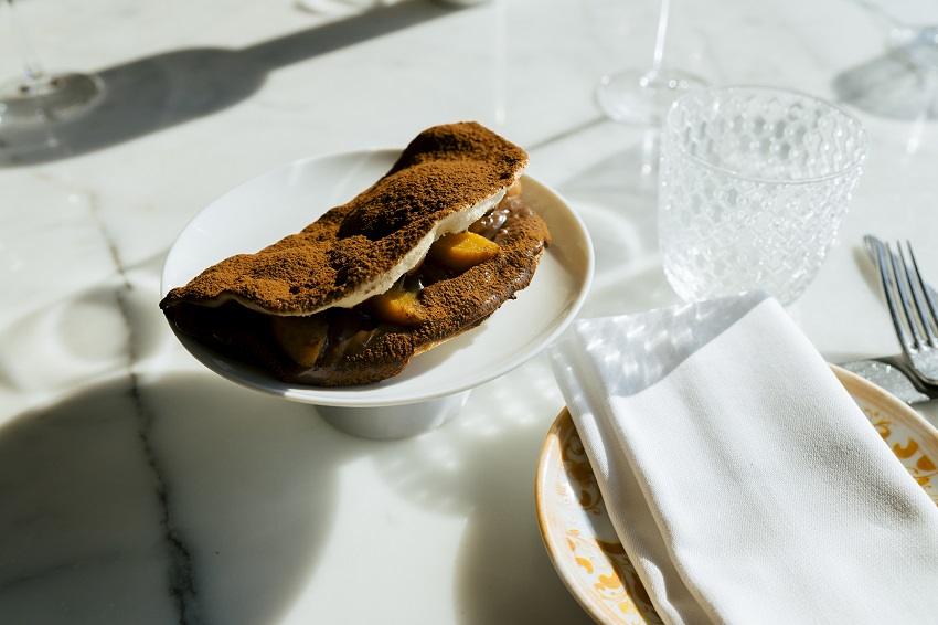 Accanto alla novità salata, debutta anche una nuova pizza-dessert: cioccolato e albicocche, ispirata alla Sachertorte. La farcitura abbina crema pasticcera al cacao e nocciole, confettura di albicocche e pesche rustiche sciroppate, creando un equilibrio tra cremosità e croccantezza. Resta in carta anche la variante già molto apprezzata con crema al mascarpone e gocce di cioccolato.