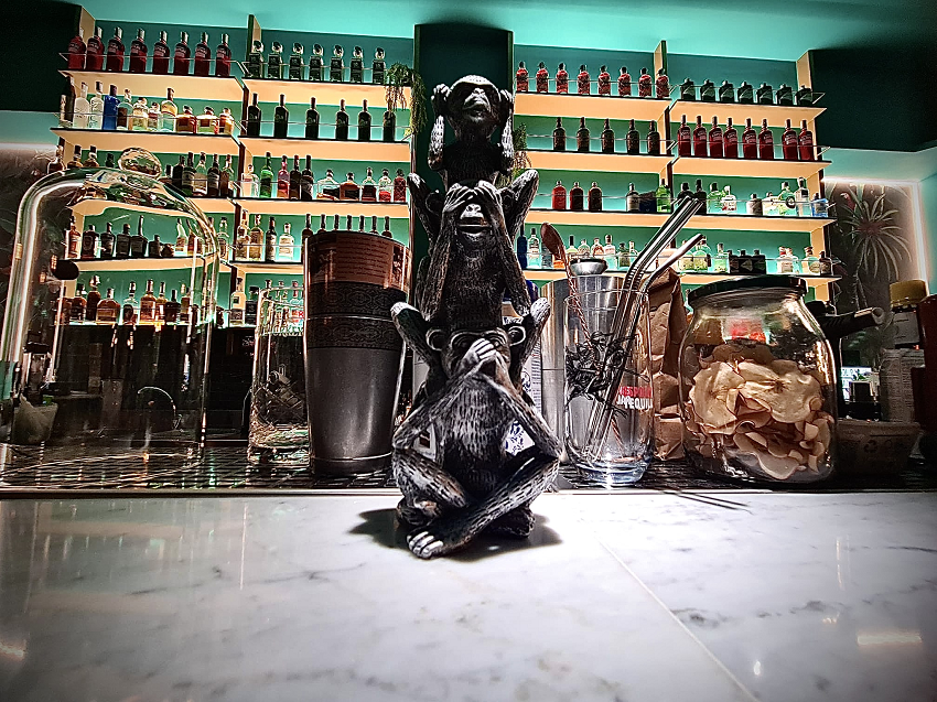 Jigger (proprio come il misurino usato nella preparazione dei cocktail), nella sua seconda nuova sede, richiama lo stile dell’indirizzo romano: arredi jungle, lampade suggestive e uno stile tropicale con carte da parati colorate e vivaci. Qui il protagonista è il grande bancone centrale che accoglie fino a dieci posti a sedere, tutto intorno altri quaranta coperti (esclusi quelli esterni durante la bella stagione). La natura si prende la scena con le sfumature più belle del verde, da quelle degli sgabelli al bancone al verde acqua delle pareti. Dagli alti soffitti scivolano piante e le luci illuminano la bottigliera in ottone ma anche poltrone, panche scure con cuscini dalle stampe sgargianti.