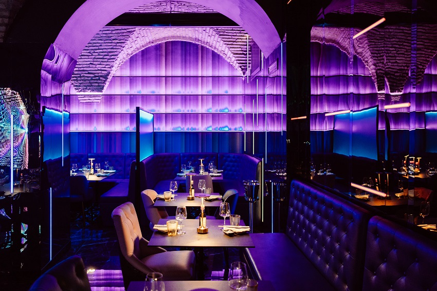 L’atmosfera è curata nei minimi dettagli grazie al progetto dell’architetto Fabio La Commara, che ha trasformato lo spazio in un mix perfettamente bilanciato tra stile industriale, richiami orientali e tocchi glamour. A colpire subito è il grande lampadario custom, protagonista della sala principale, così come i velluti pastello e le tappezzerie esotiche che strizzano l’occhio al Giappone e alla Corea. La scenografica scala illuminata che collega i due piani diventa un elemento teatrale, pensato per introdurre a un cambio di ritmo e atmosfera.