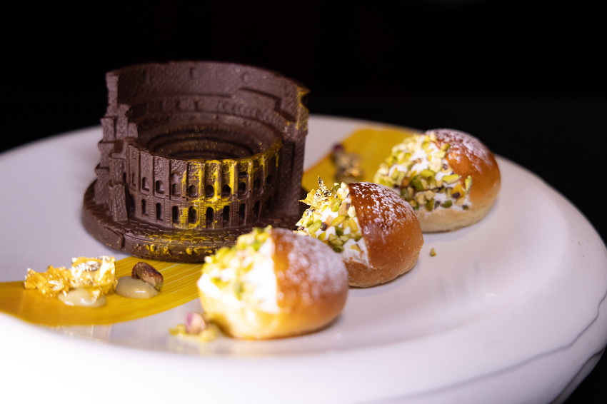 La pasticceria del Pastry Chef Silvia Moroni che declina la tradizione con le emozioni di Allegrío con il suo maritozzo “coraggioso” accompagnato dal simbolo romano del coraggio dei gladiatori romani: il Colosseo di cioccolato amaro al 85%, insieme alla crostatina di visciole e mirtilli che attira “l’invidia” di tutti i gusti, con la “fortuna” della pastiera napoletana, la “passione” del babà, la “nostalgia” del suo primo assaggio da piccola del caffè amaro con la crema di mascarpone all’uovo da cui nasce il suo tiramisù, per passare alla “gioia” infinita espressa dall’emblema dell’allegria tipica romana: la bomba fritta farcita con crema o nutella – una vera gioia per il palato!