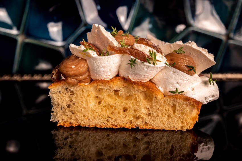 Il nuovo autunnale Fluffy Mont Blanc: chantilly alla fava tonka, marmellata di castagne alla brace, marron glacé e meringa al rosmarino. L’impasto soffice e dolce, fusione del concetto di pizza e brioche, richiama per la tipologia di lavorazione il grande lievitato per eccellenza, il panettone e gli ha consentito di ricevere il premio speciale Best Pastry 2024 dalla The Best Pizza .