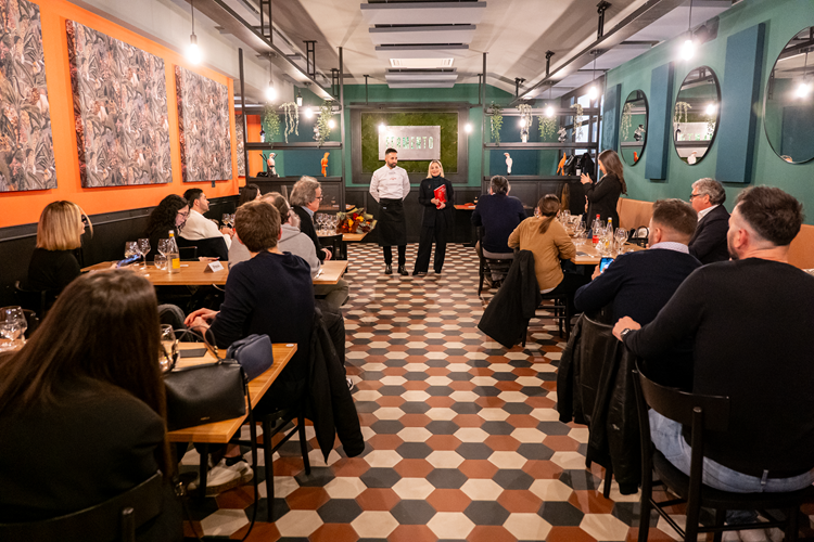 La cornice dell’evento è stata Fermento, la pizzeria di Federico Visinoni, riconosciuta con due spicchi dalla guida Gambero Rosso e punto di riferimento per la pizza tonda contemporanea nel Lazio. Una realtà che fa del rapporto tra pizza e vino la propria cifra distintiva, grazie a fermentazioni controllate, ingredienti territoriali e una carta dei vini di alto profilo.