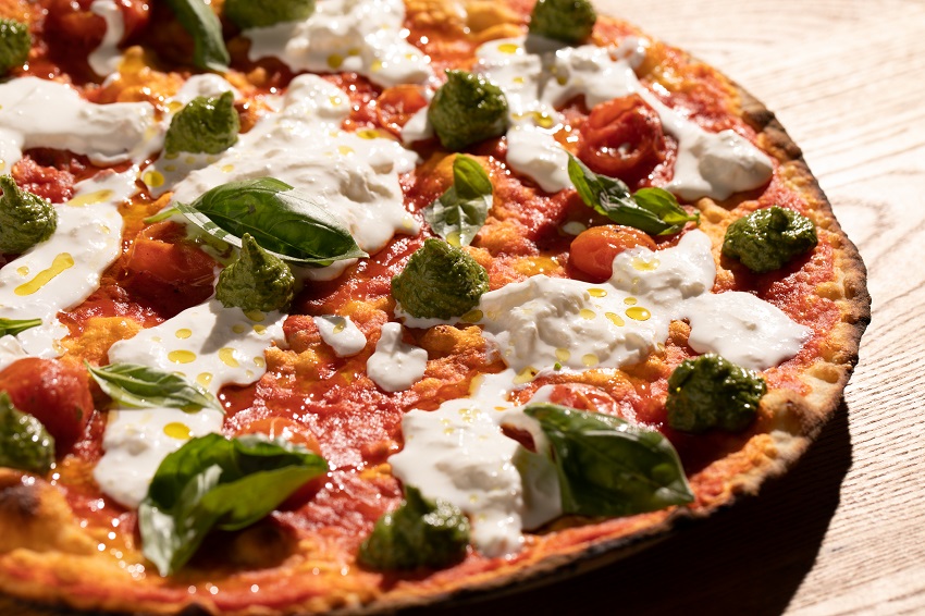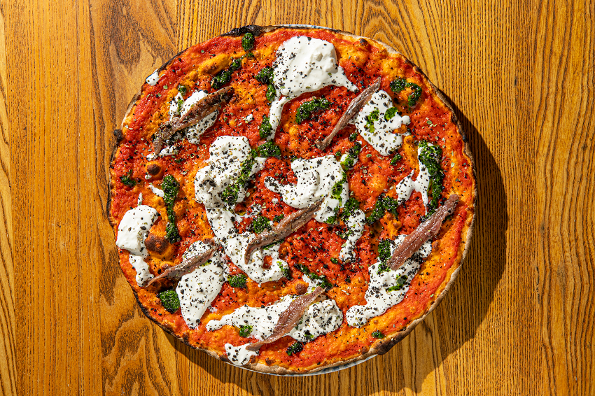 Cuore del menu, le pizze, sono realizzate da Gabriele Tomassetti con un impasto dalla notevole idratazione, oltre il 70%, un mix di farine di grano tenero tipo 00 e tipo 1 di Cinque Stagioni, per un panetto di 170 grammi che riposa per 24 ore e viene steso al mattarello, come vuole la tradizione. La lista delle tonde comprende tutte le classiche, dove spicca la capricciosa, particolarmente apprezzata dal pubblico per l’attenta scelta degli ingredienti, come il culatello di crudo, l’oliva taggiasca, e il carciofo alla brace. Troviamo poi le “svariate”, linea identitaria del locale che, come sottolinea il pizza-chef, “ho pensato in modo da offrire ai nostri clienti delle pizze in cui ogni morso è caratterizzato da un gioco tra i topping, quelli in cottura e quelli freddi, aggiunti al termine della preparazione”. Per ogni “svariata” è suggerito un drink di accompagnamento, e così troviamo che l’identitaria “Amatriciana di Gabriele” (pomodoro, guanciale di Amatrice, cipolla caramellata e crema di pecorino) è proposta con un cocktail a base di tequila, mezcal, lime e soda al pompelmo, per un gioco di contrasti tra il vegetale, l’affumicato e l’agrumato.